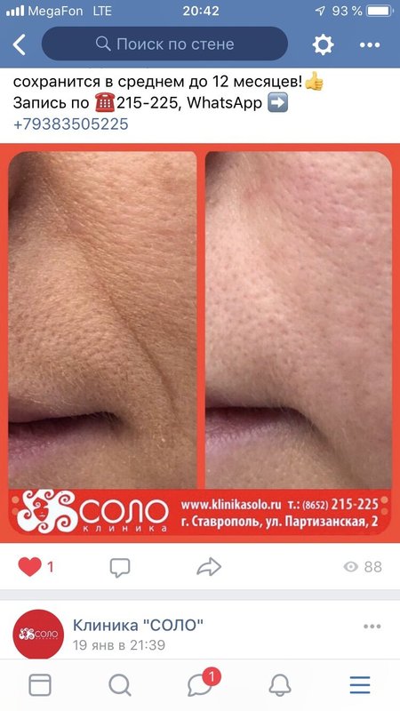 Раньше я не очень верила таким клиникам, думала, что помолодеть на 10 лет - это невозможно, просто рекламный трюк. Но пару месяцев назад я решилась, сделала себе карбокситерапию, а затем инъекции ксеомина и радиеса. Эффект все лучше и лучше, я радуюсь себе в зеркале, на фотографиях, я снова стала любить себя! Потому что морщины ушли без следа.Спасибо большое врачам Соло! Они действительно профессионалы!